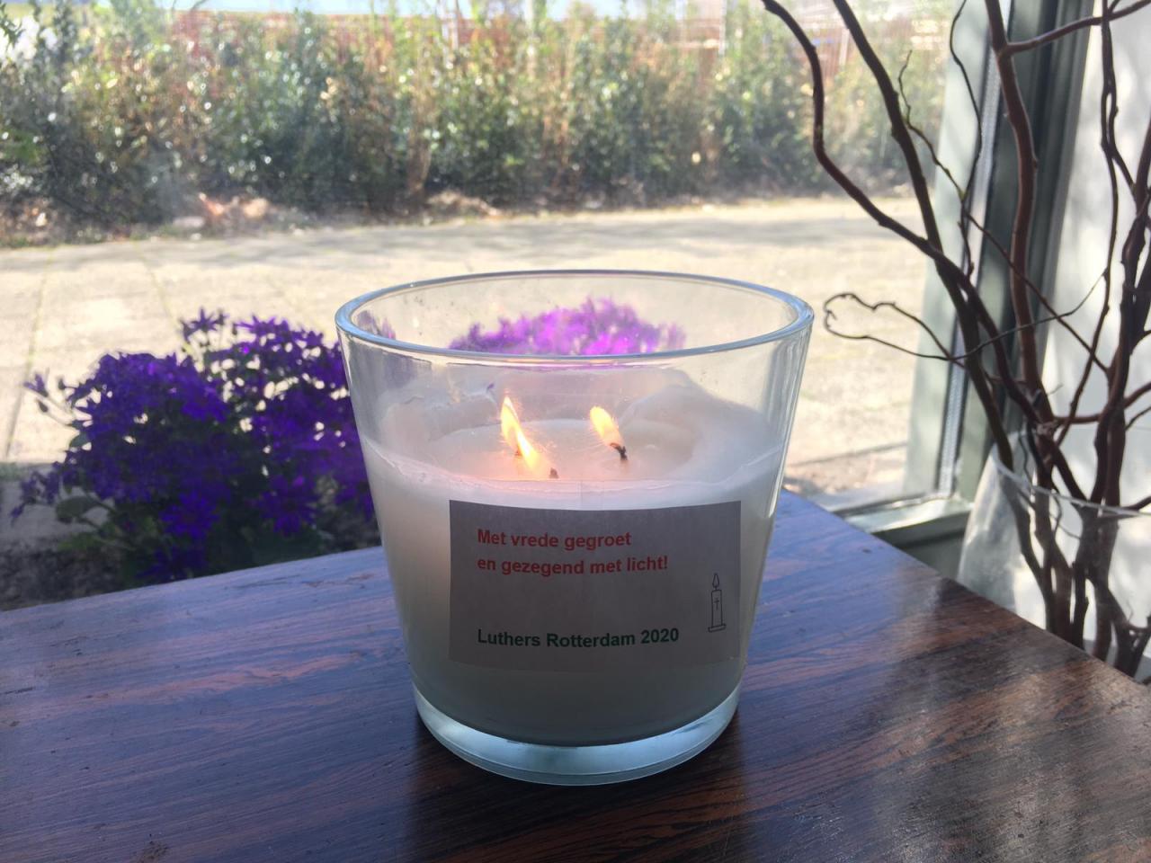 Leg de tekst zichtbaar bij een ontstoken kaars (of eventueel een led-lichtje als kaarsenbranden niet gaat). Of bijvoorbeeld voor kinderen: plak dit op een leeg glazen potje en doe daarna een waxinelichtje er in en steek dat aan. Maak daarna een foto en stuur die naar: andreaskerkrotterdam@gmail.com. Graag uiterlijk zaterdagavond om 21 uur.